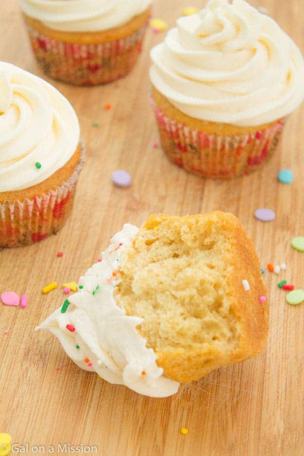 I love how moist and fluffy these vanilla cupcakes are. I always add buttermilk into the recipe because it gives it the perfect moistness. Tastes almost like a light and fluffy pound cake. I love me some pound cake.